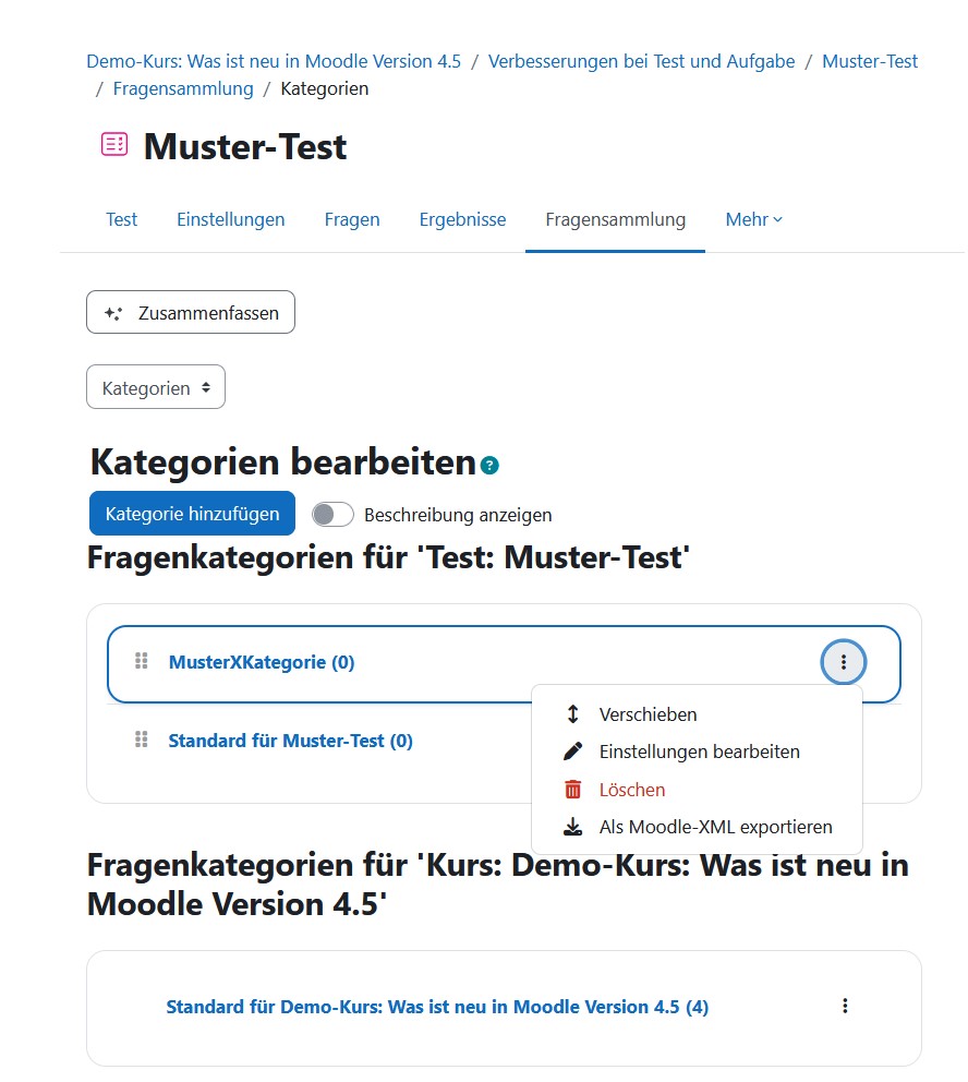 • Bei der Fragensammlung des Tests können jetzt Fragekategorien per Drag & Drop (einfach ziehen und ablegen) bearbeitet werden. Außerdem können weitere Einstellungsmögleichkeiten direkt an der Kategoriekarte gewählt werden.
