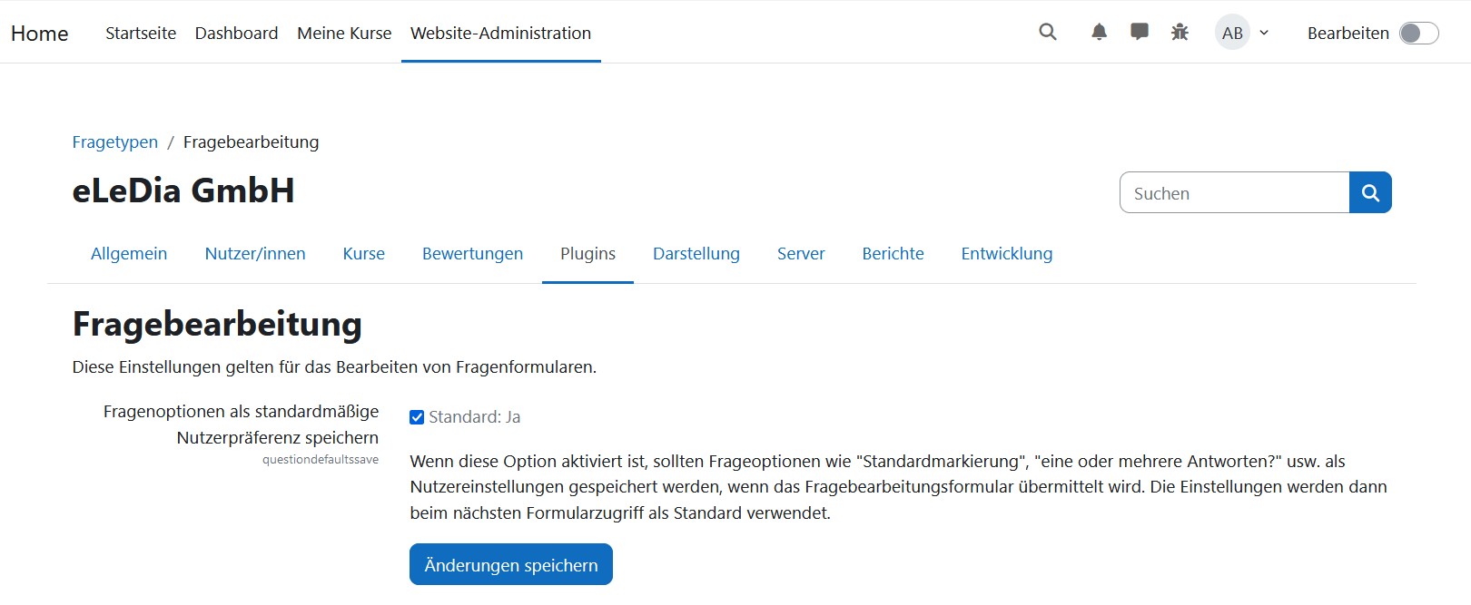 • Sie haben die neue Option bei der Website-Administration (Website-Administration/Plugins/Fragetypen/Fragebearbeitung) „Fragenoptionen als standardmäßige Nutzerpräferenz speichern“ an- oder auszuschalten.